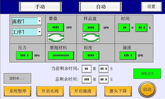 2) 單工序模式:根據(jù)每一步磨拋工序,可設(shè)置和調(diào)用30種工序參數(shù):磨盤和磨頭轉(zhuǎn)動速度、磨拋時間、水通斷……